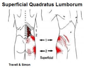 Quadratus lumborum – because the superficial part of it refers laterally, they will often point more laterally – rather than paraspinous as you see in facet syndrome or more sacral dimples as you see in SI joint syndromes.