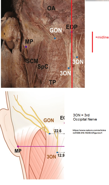 - What I found is actually most tender is the 3rd subcutaneous occipital nerves – they come up just on the sides of the spinous process so you track up near midline. Injecting them is very important.