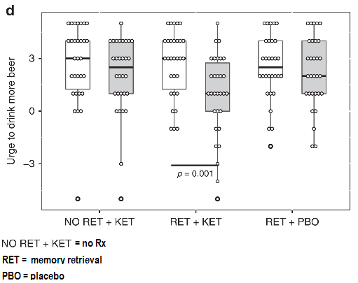 Das, R. K., Gale, G., Walsh, K., Hennessy, V. E., Iskandar, G., Mordecai, L. A., … & Kamboj, S. K. Ketamine can reduce harmful drinking by pharmacologically rewriting drinking memories. Nature communications, 10(1), 1-10 (2019).
